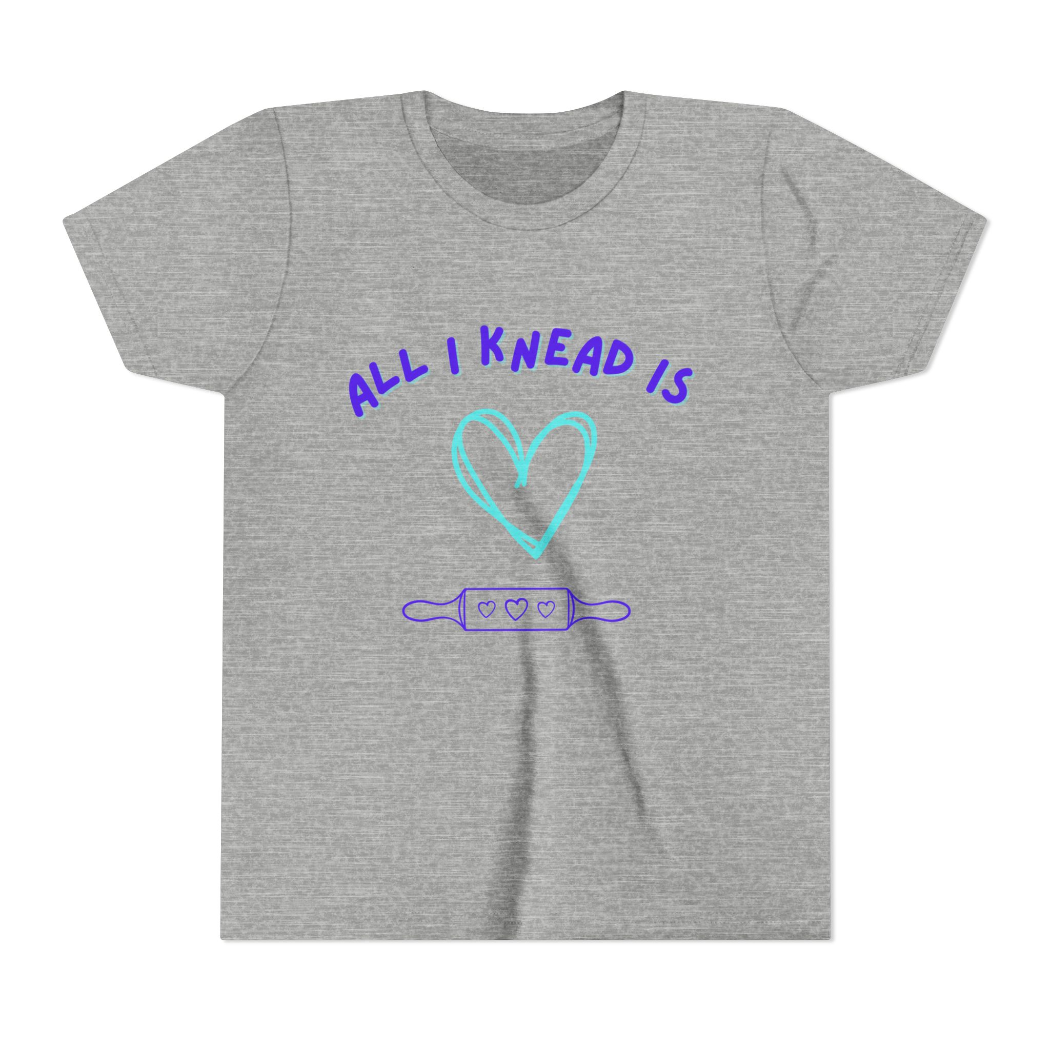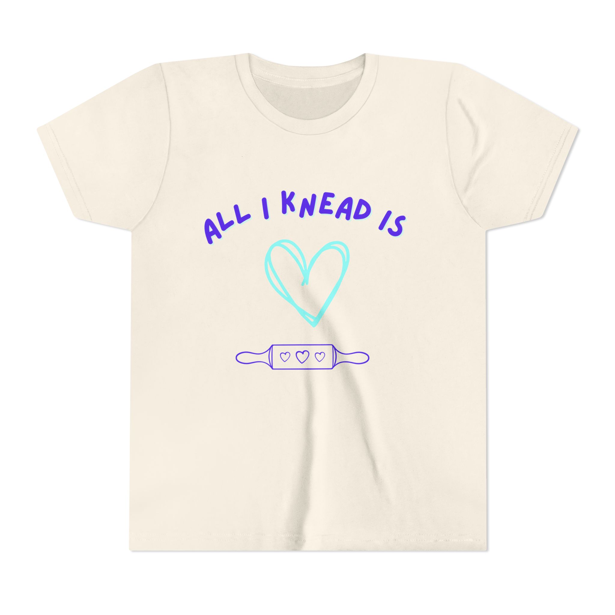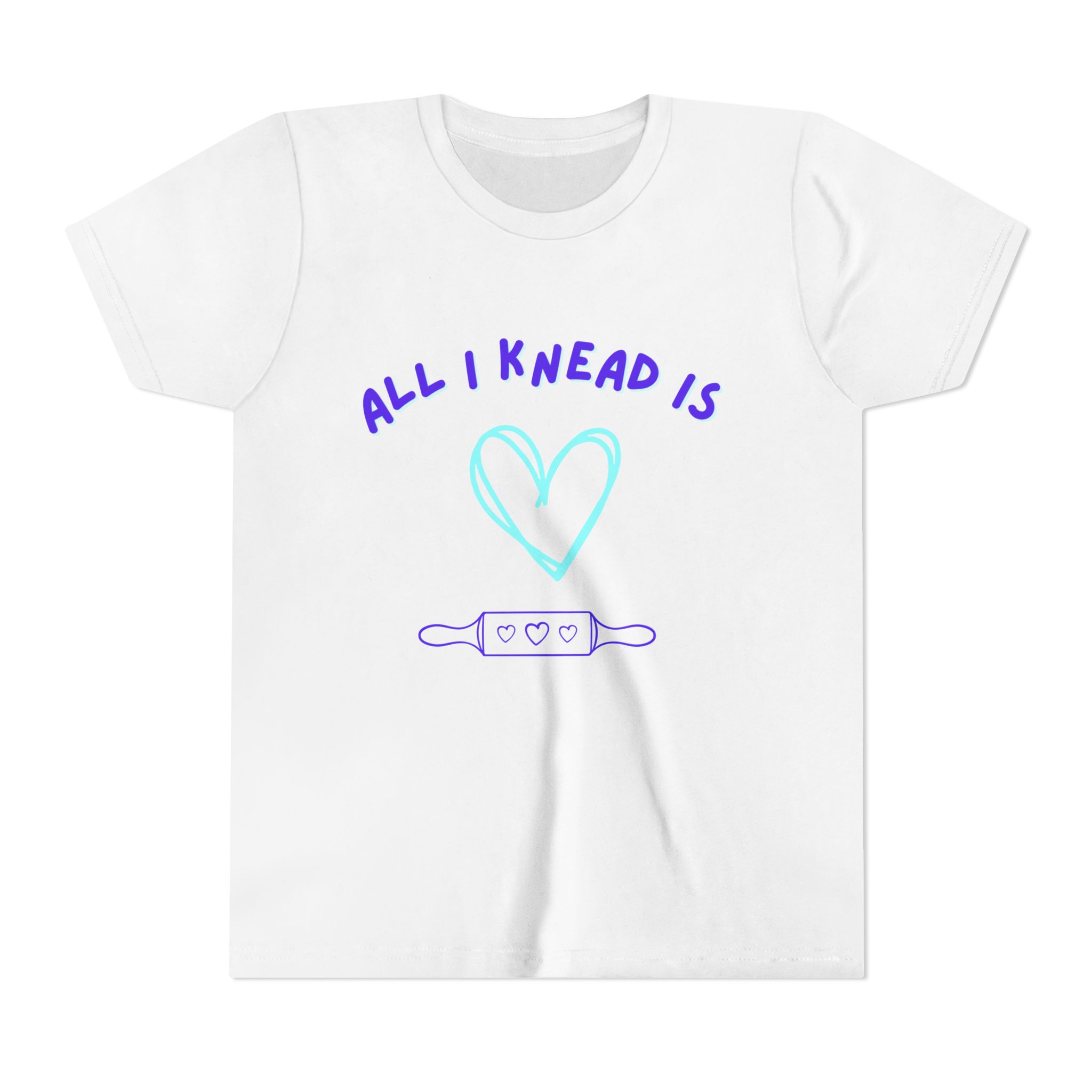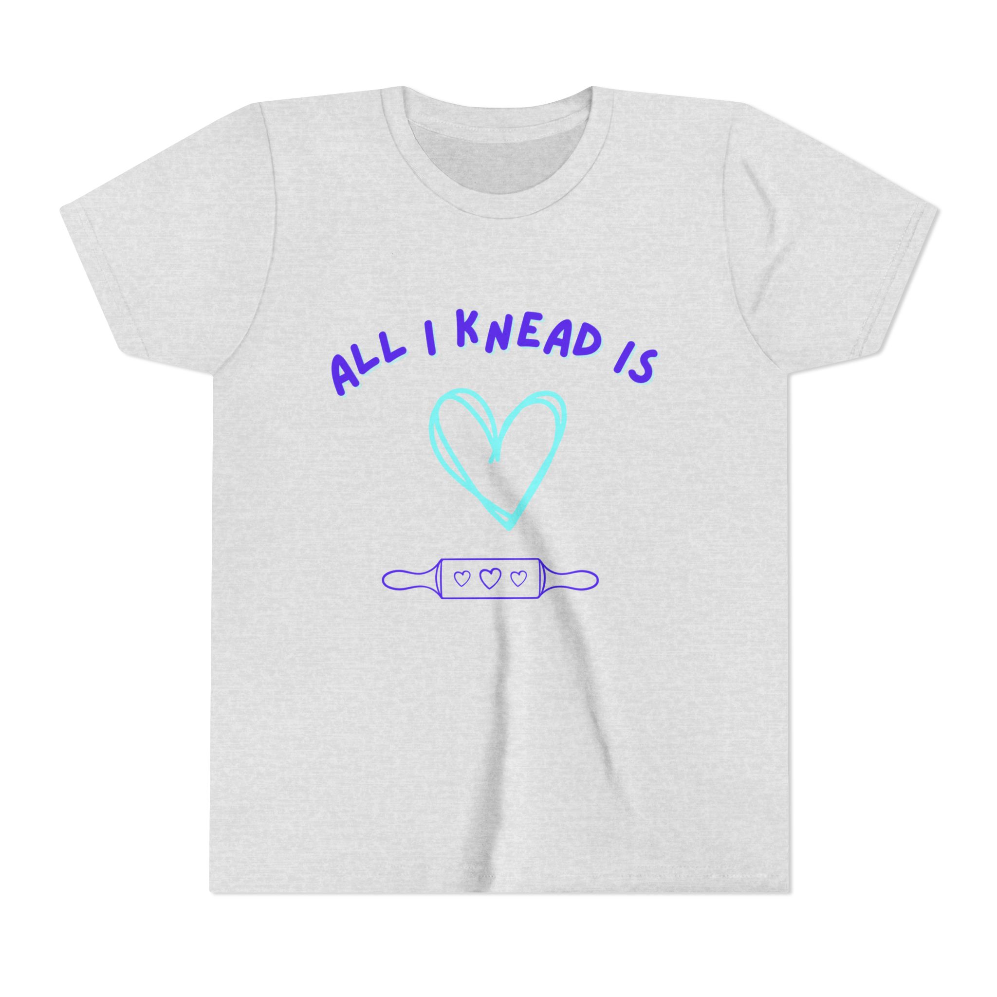 ‘All I Knead is Love’ Kids will love this custom youth short sleeve tee. This lightweight side-seamed shirt maximizes comfort all day long. The ring-spun cotton makes this kids short sleeve tee perfect for displaying custom artwork. Side seams keep the garment’s shape. The shoulders have tape for longer fitting. The collar is extra elastic due to ribbed knitting.