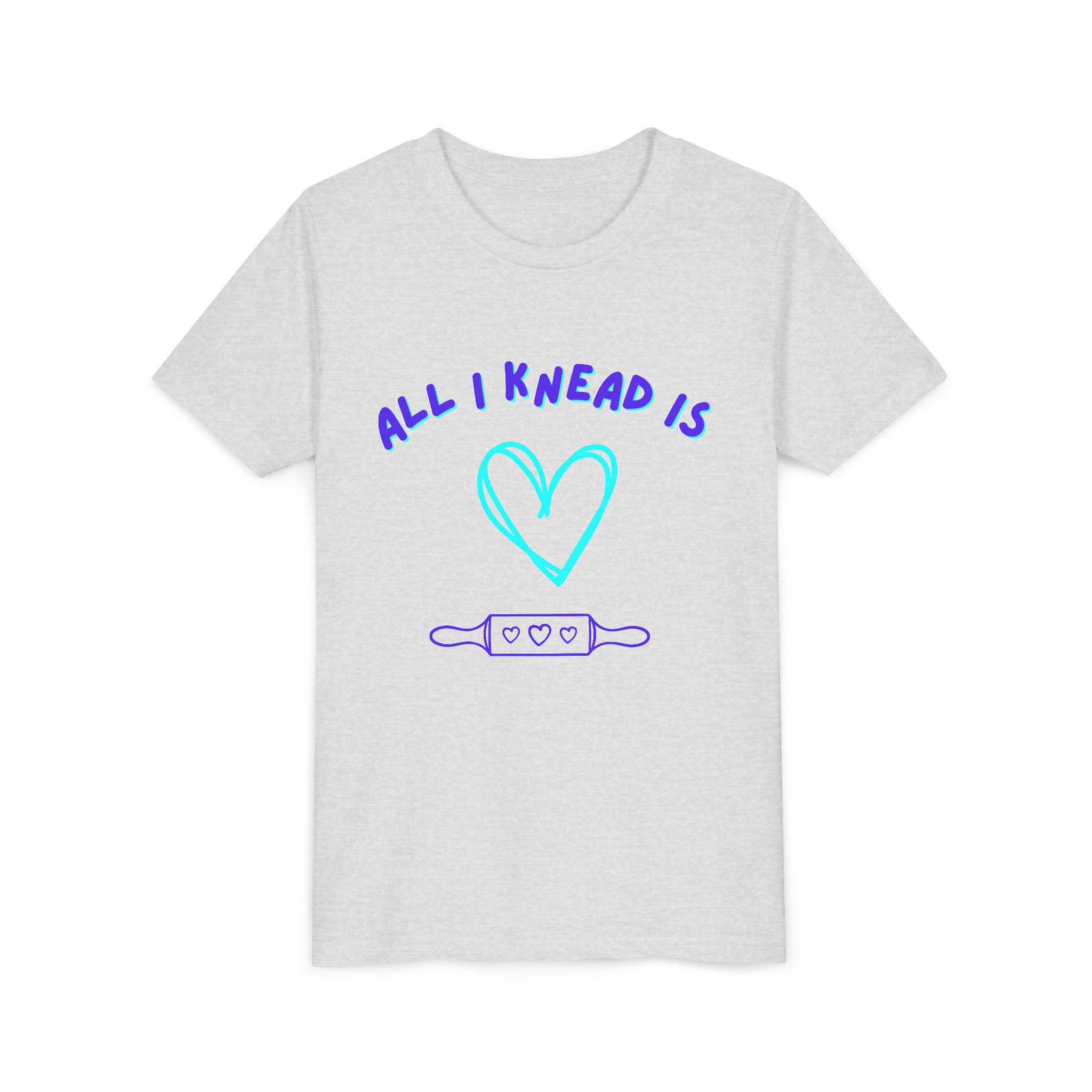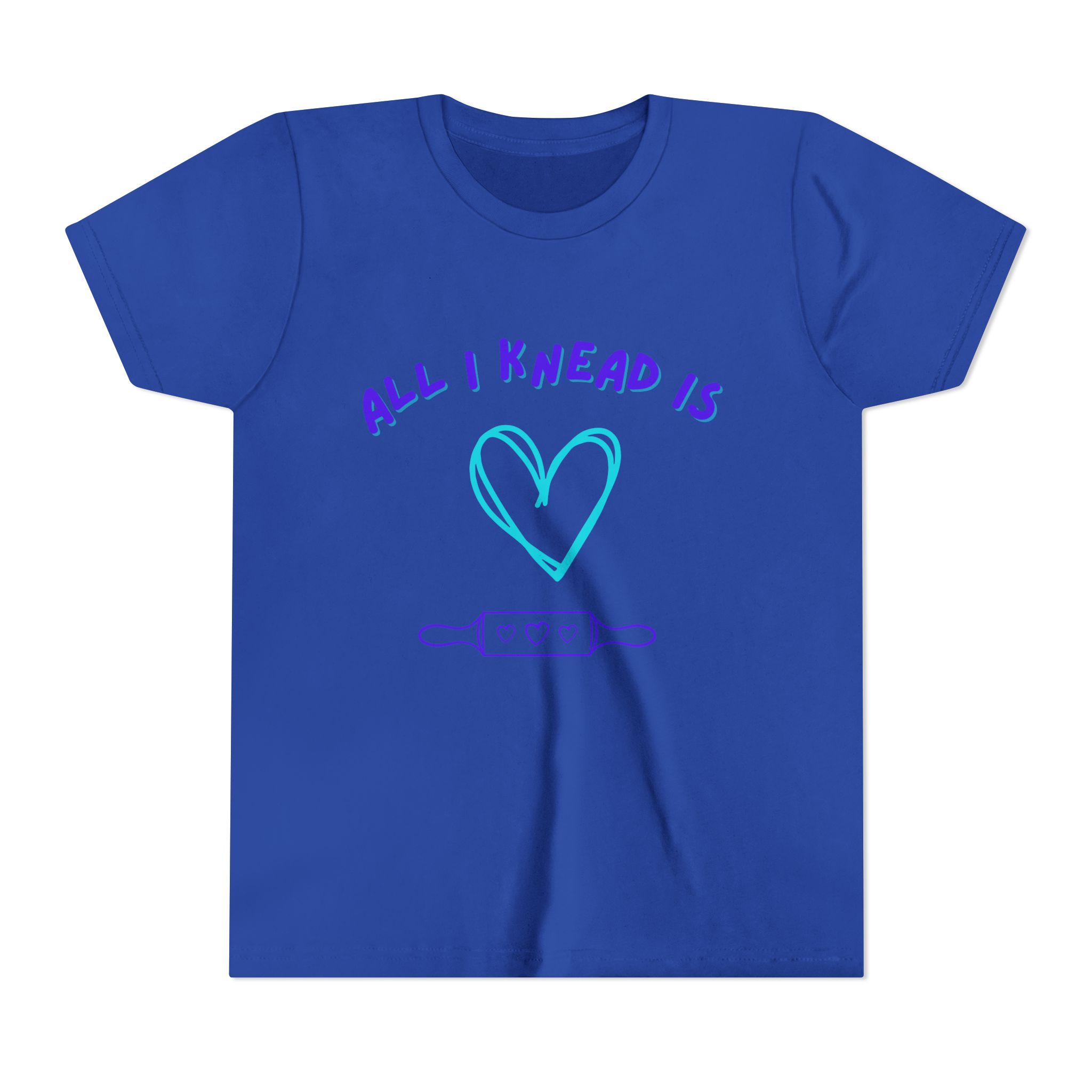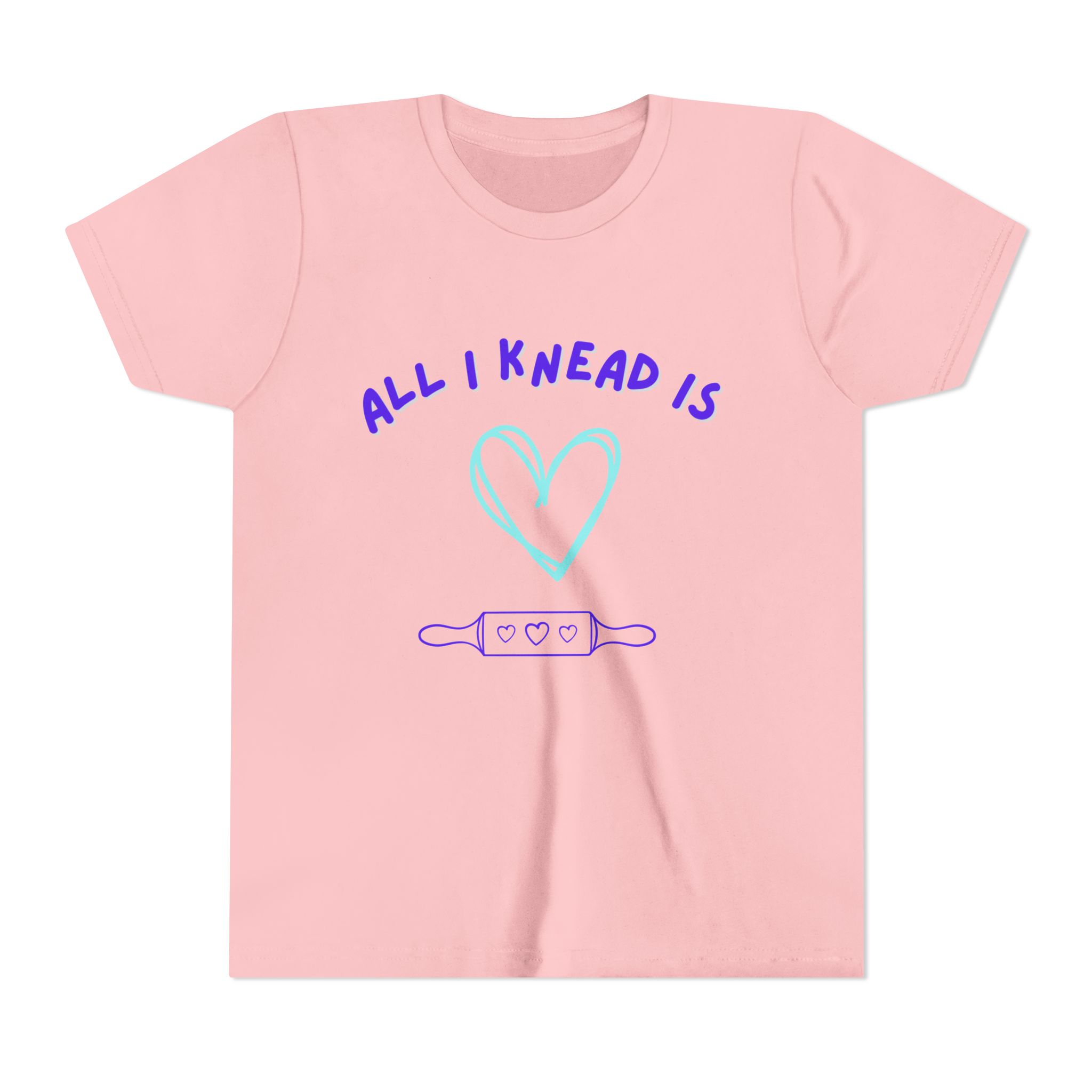 ‘All I Knead is Love’ Kids will love this custom youth short sleeve tee. This lightweight side-seamed shirt maximizes comfort all day long. The ring-spun cotton makes this kids short sleeve tee perfect for displaying custom artwork. Side seams keep the garment’s shape. The shoulders have tape for longer fitting. The collar is extra elastic due to ribbed knitting.