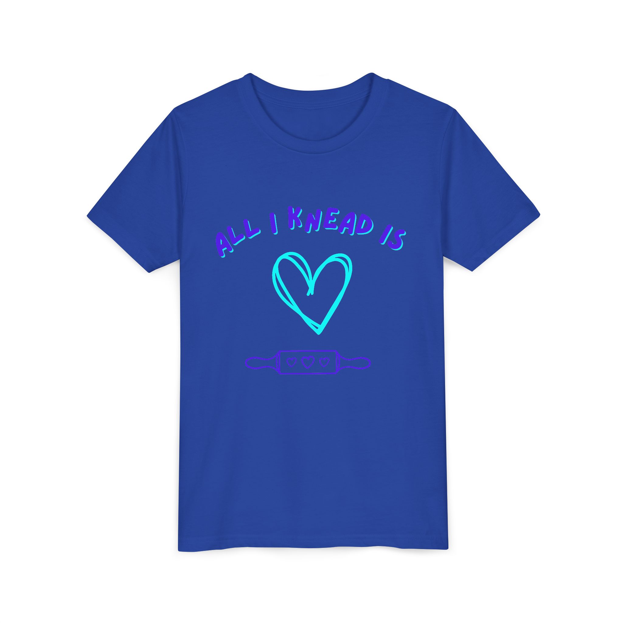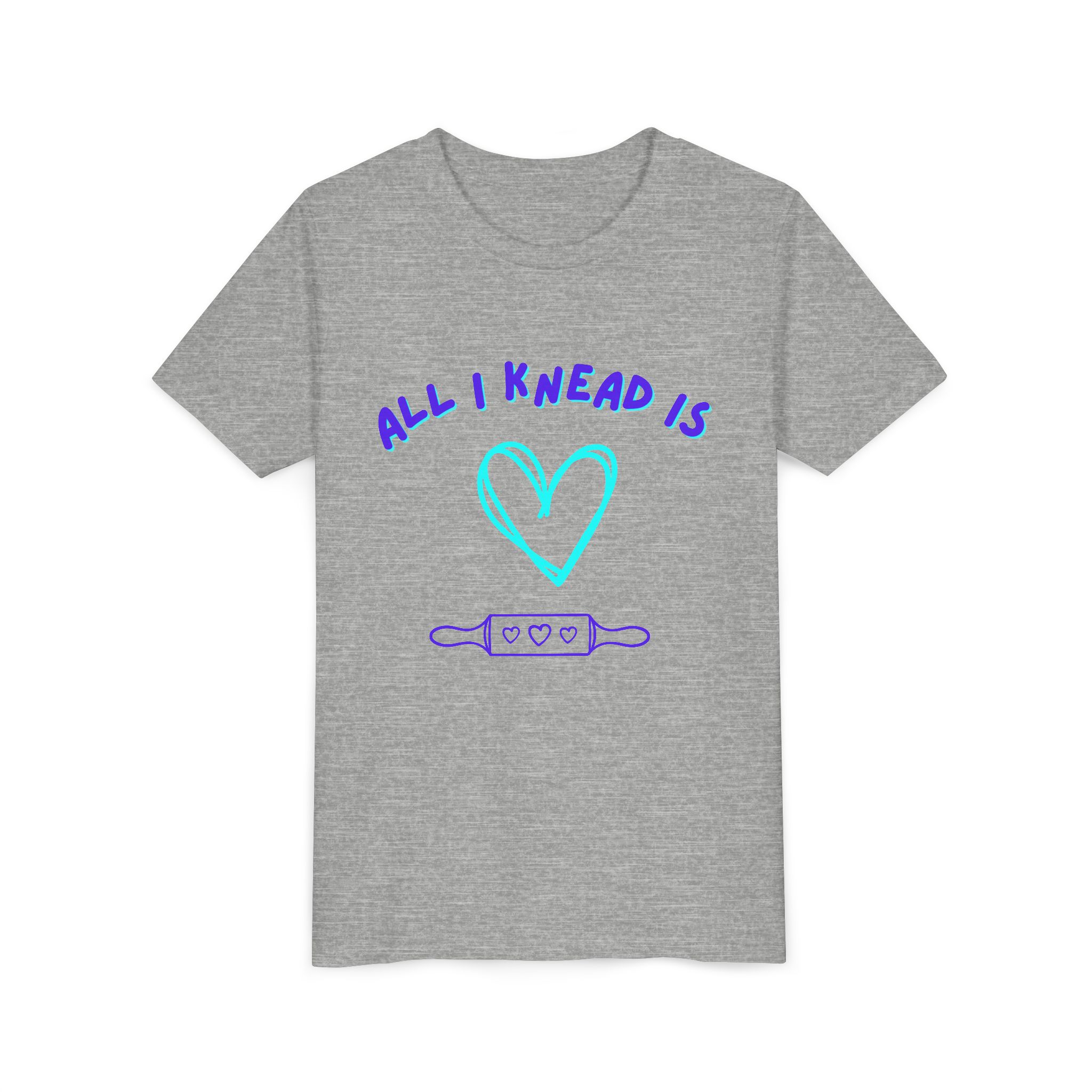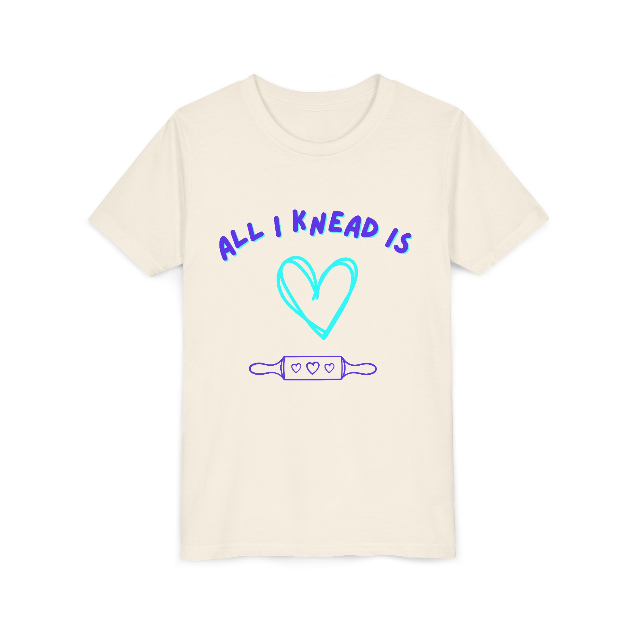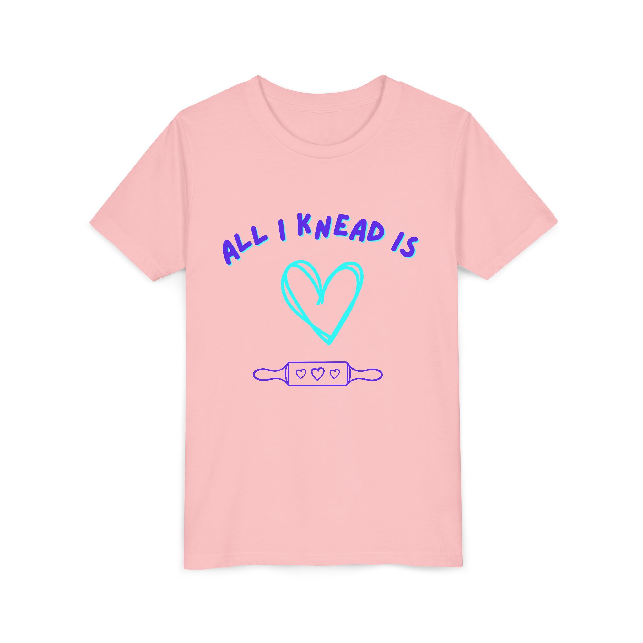 ‘All I Knead is Love’ Kids will love this custom youth short sleeve tee. This lightweight side-seamed shirt maximizes comfort all day long. The ring-spun cotton makes this kids short sleeve tee perfect for displaying custom artwork. Side seams keep the garment’s shape. The shoulders have tape for longer fitting. The collar is extra elastic due to ribbed knitting.