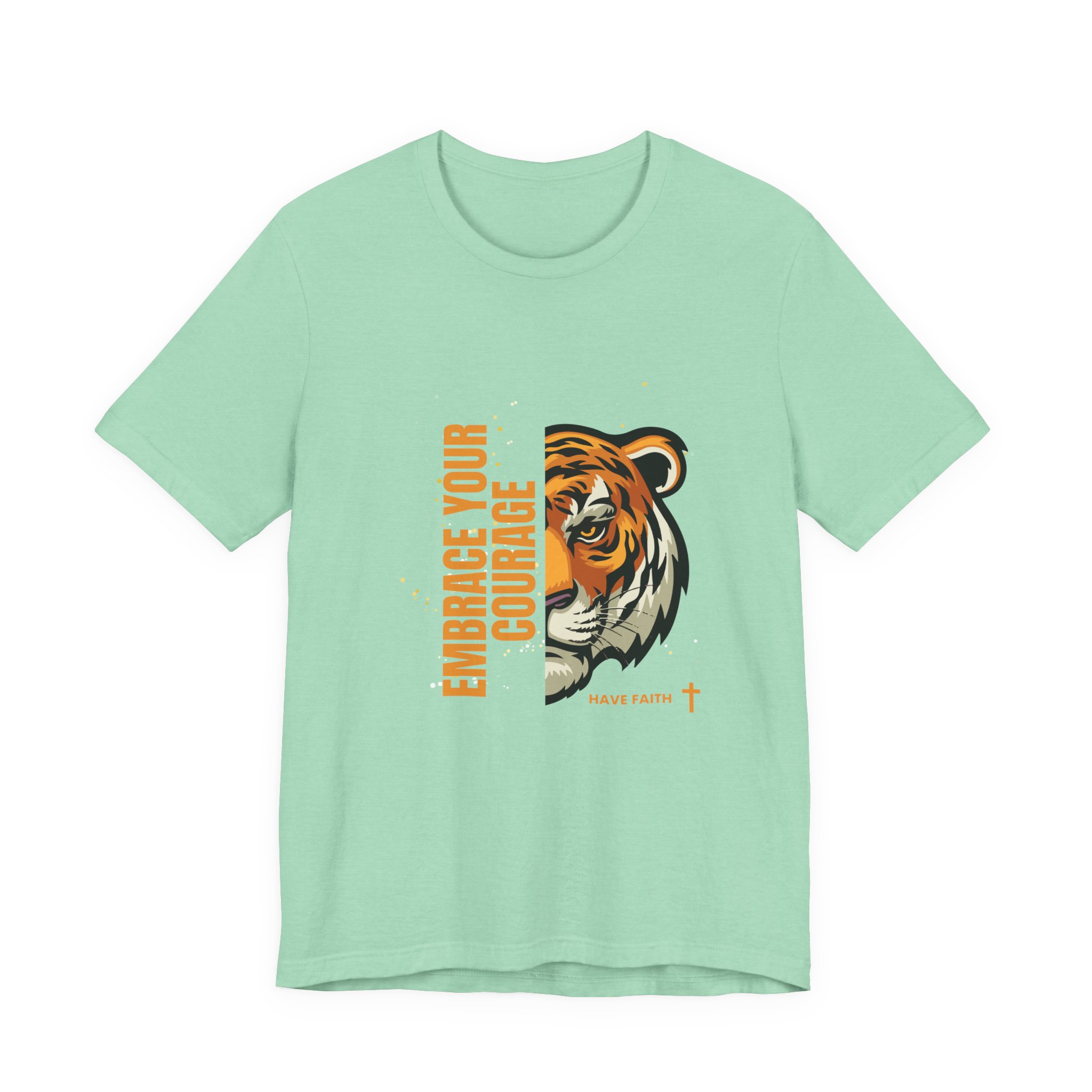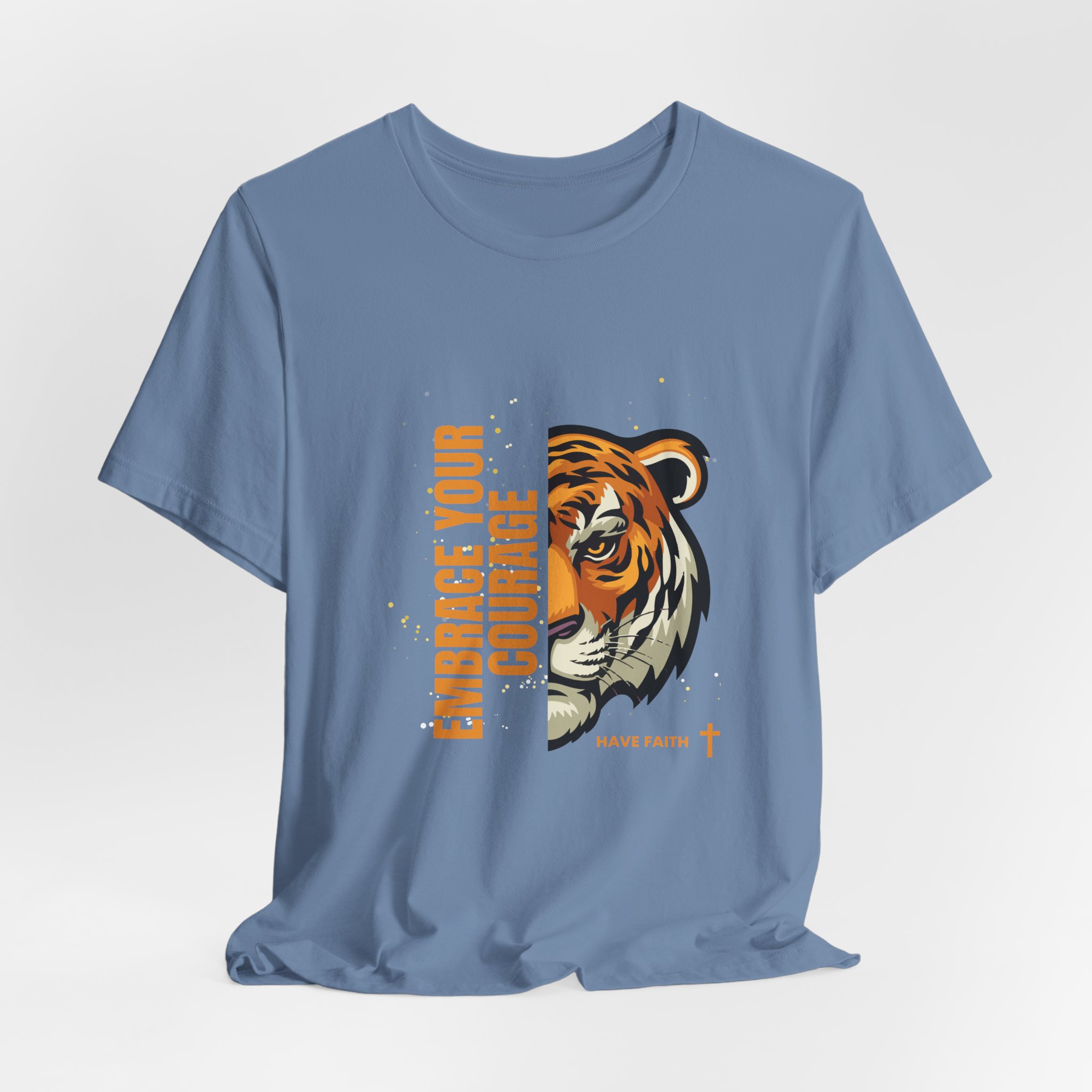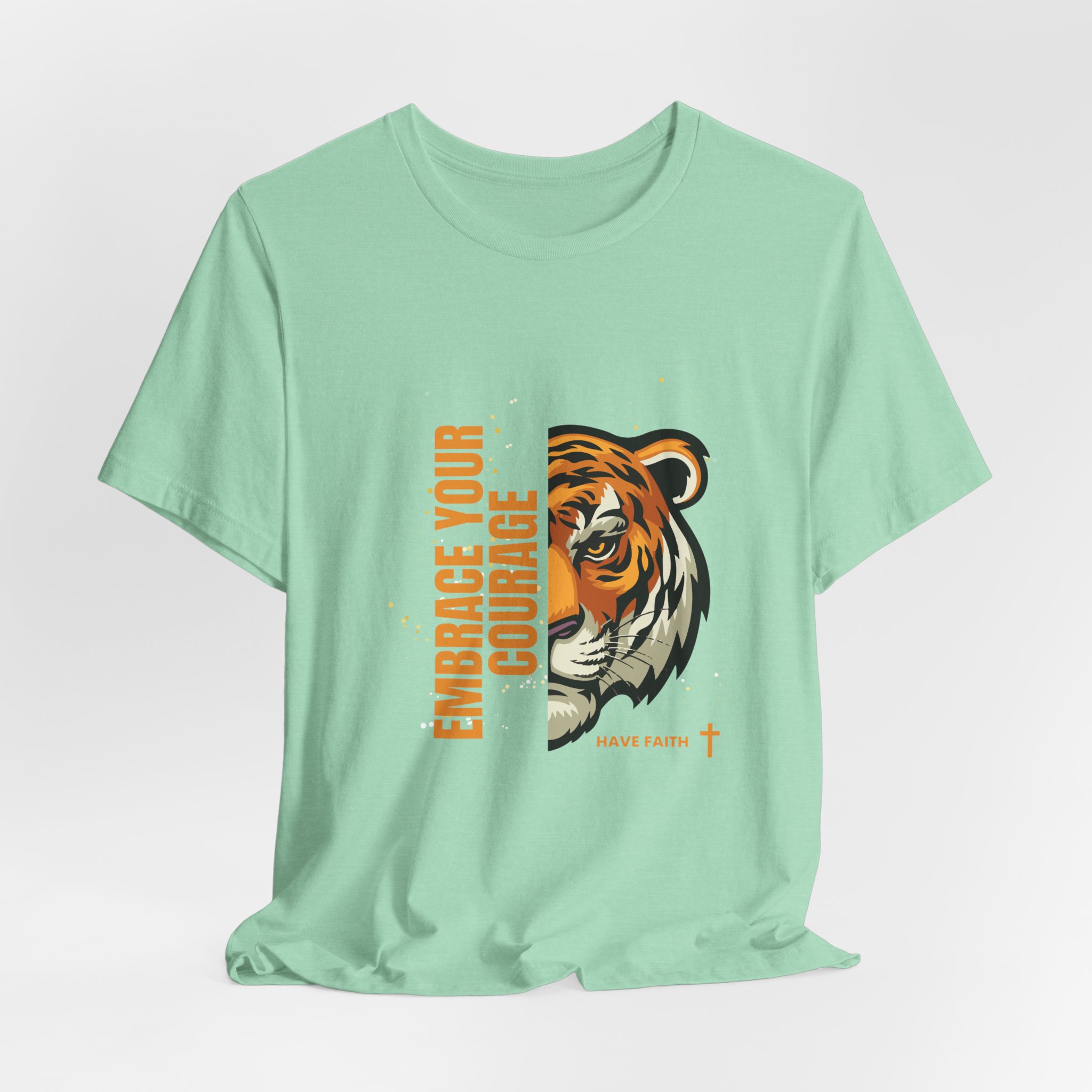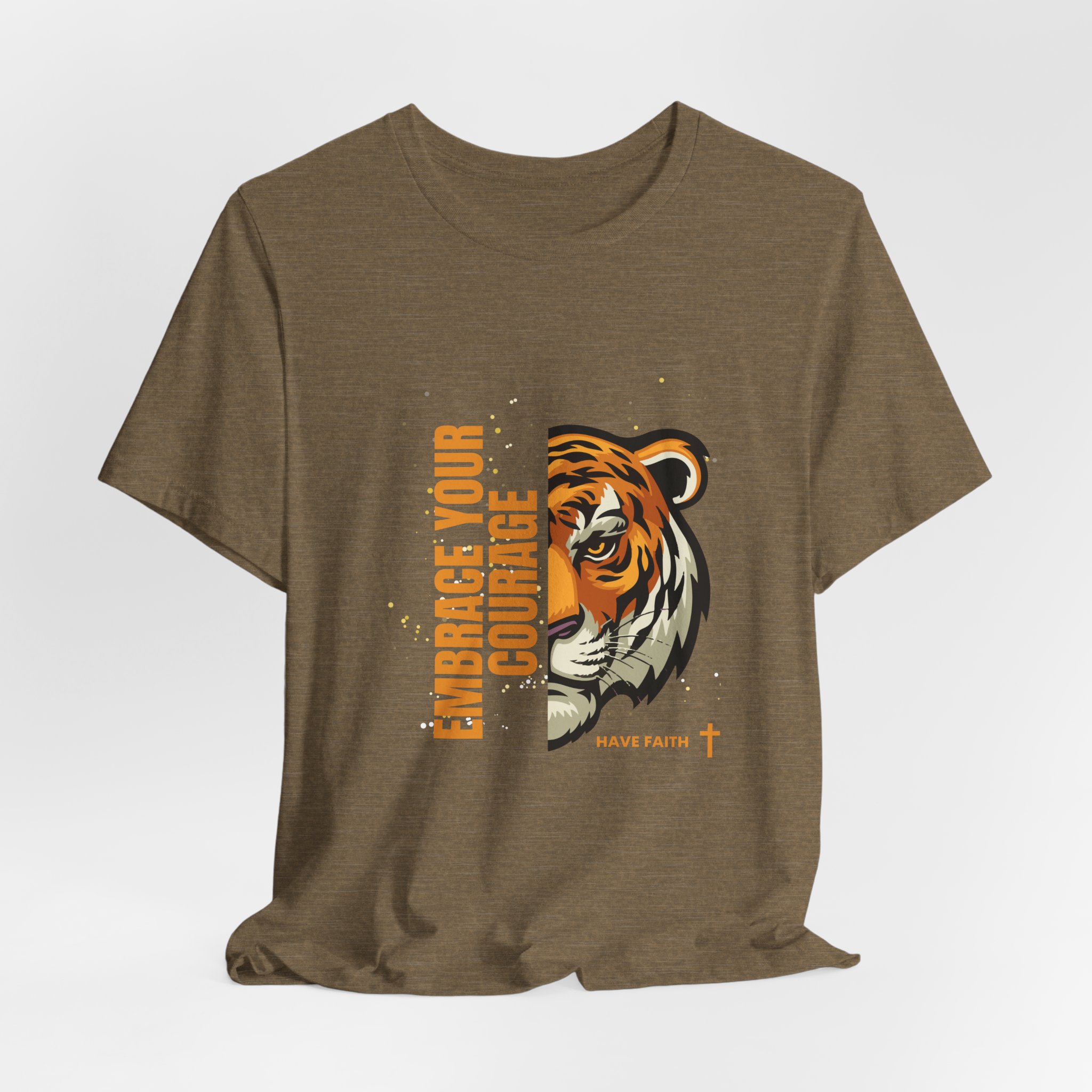 Have faith and be couragous today! We all have it in us to do His work! Made on a Bella+Canvas 3001 soft t-shirt made in the USA, it’s the perfect shirt to start a fun conversation. This classic unisex jersey short sleeve tee fits like a well-loved favorite. Soft cotton and quality print make users fall in love with it over and over again. These t-shirts have-ribbed knit collars to bolster shaping. The shoulders are tapered for a better fit over time. Dual side seams hold the garment’s shape for longer. .: Made with 100% Airlume combed and ring-spun cotton, a lightweight fabric (4.2 oz/yd² (142 g/m²)) that is easy to layer, breathable. Perfect for active and leisure wear. .: The retail fit that is perfect for casual and semi-formal settings. The crew neckline adds a classic, neat style that’s perfect for accessorizing. .: Bella+Canvas manufactures all its products in the US and internationally in humane, no-sweat-shop, sustainable way and is part of the Fair Labor Association as well as Platinum WRAP certified. .: The tear-away label minimizes skin irritations. .: Fabric blends: Ash – 99% Airlume combed and ring-spun cotton, 1% polyester; Heather colors – 52% cotton, 48% polyester; Athletic Heather and Black Heather – 90% cotton, 10% polyester. S M L XL 2XL 3XL Width, in 17.99 20.00 22.01 24.02 25.98 27.99 Length, in 27.99 29.02 30.00 31.02 32.01 32.99 Sleeve length, in 8.90 9.17 9.45 9.72 10.00 10.39