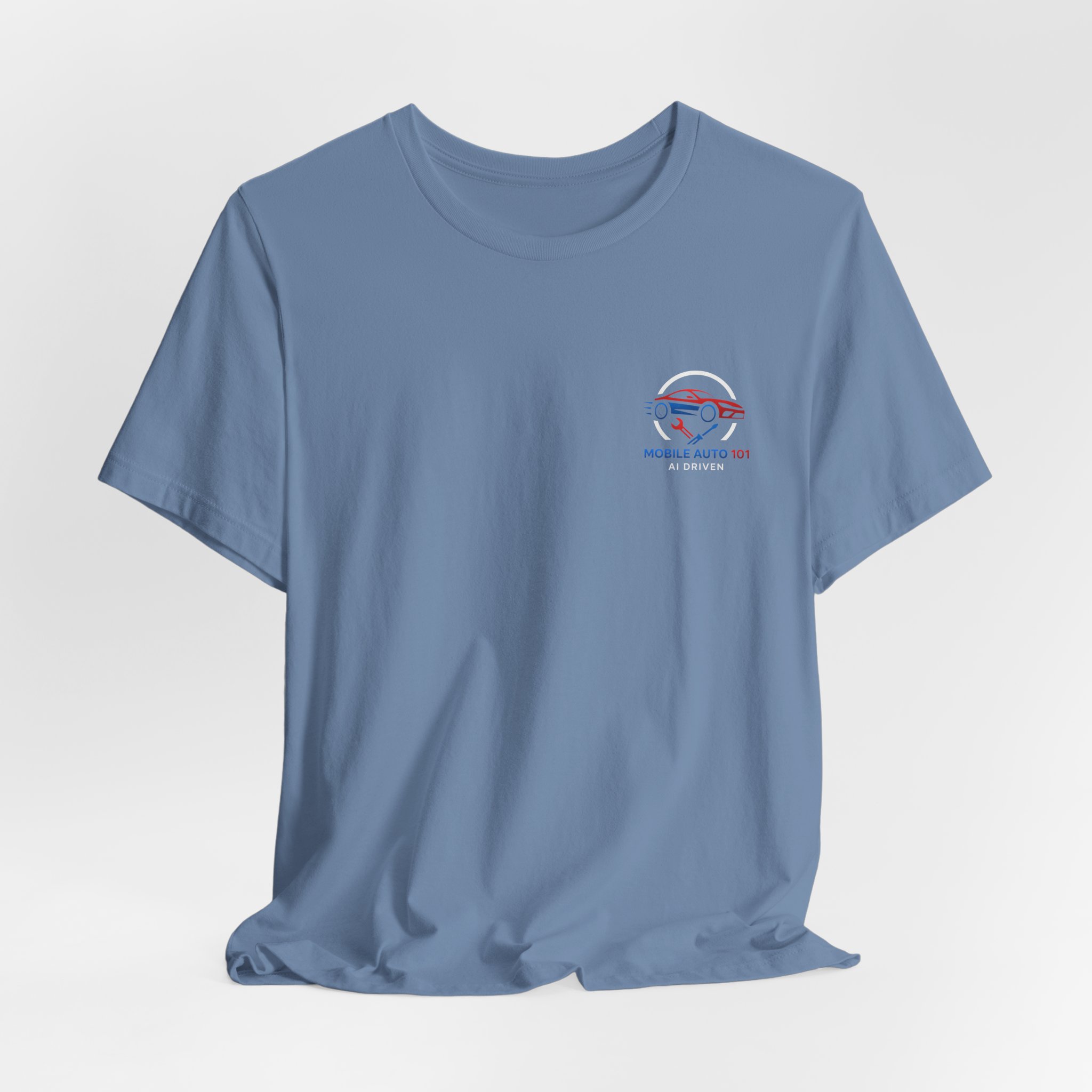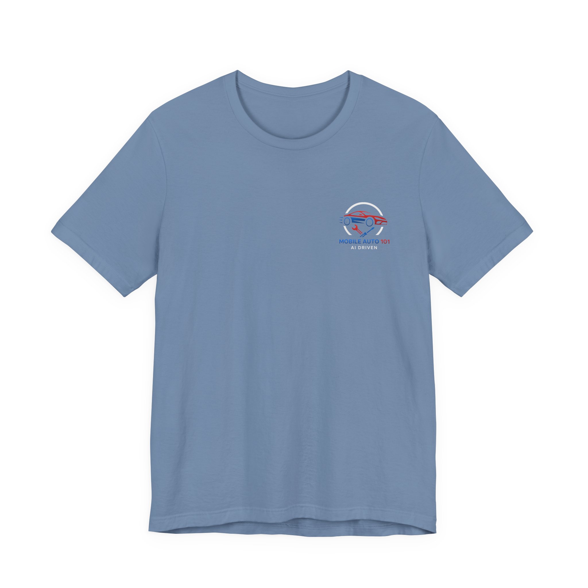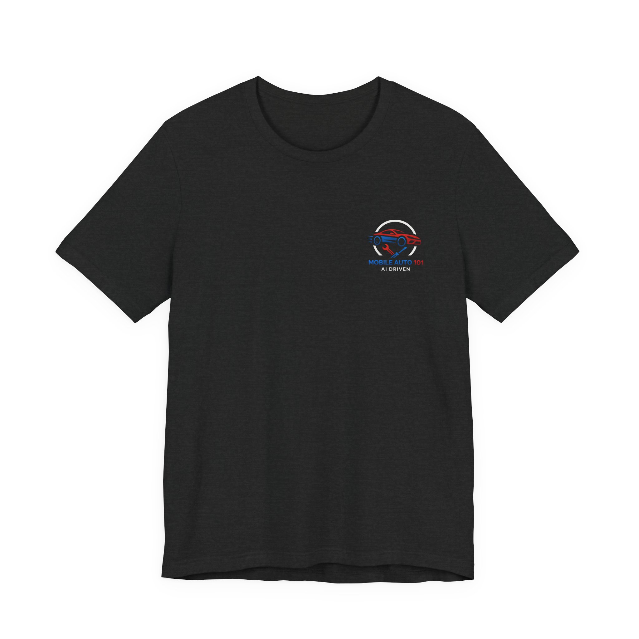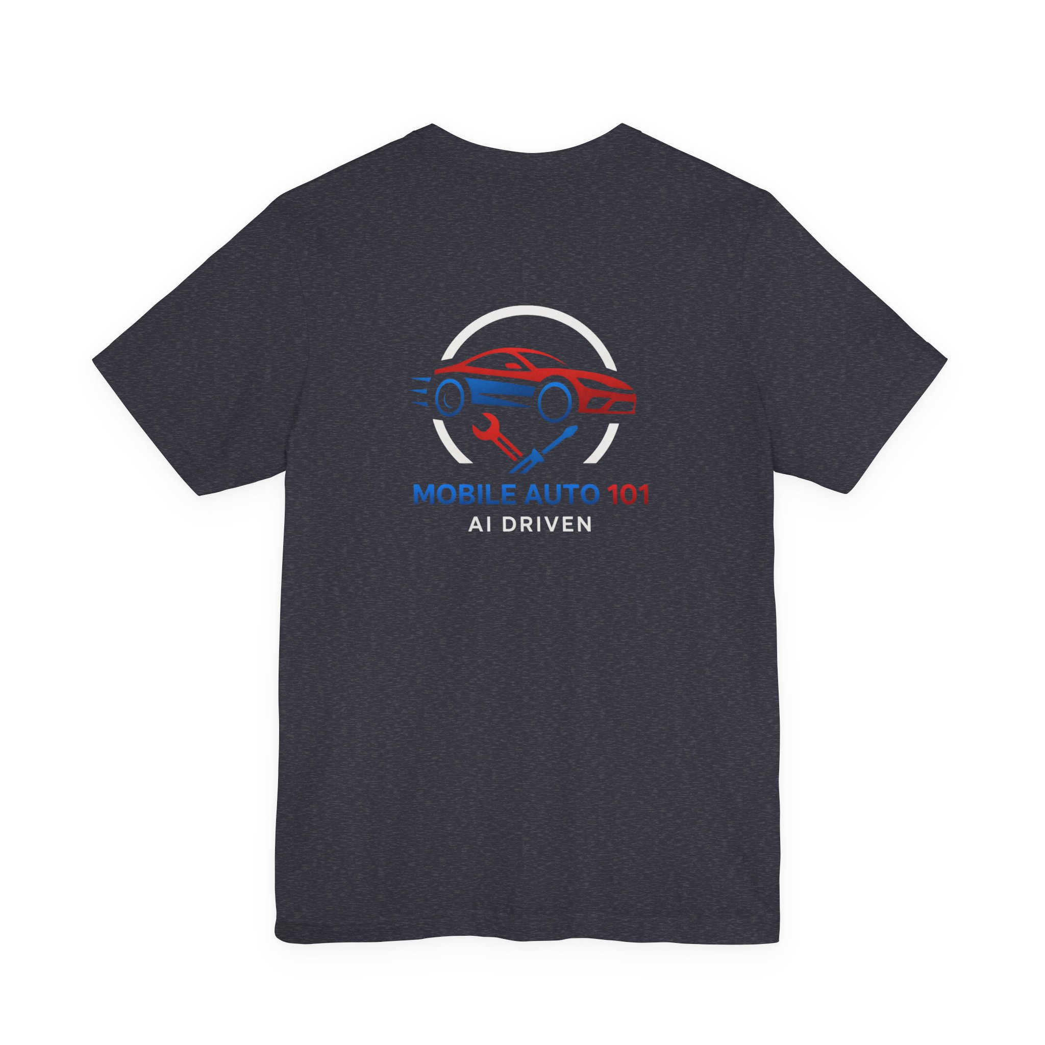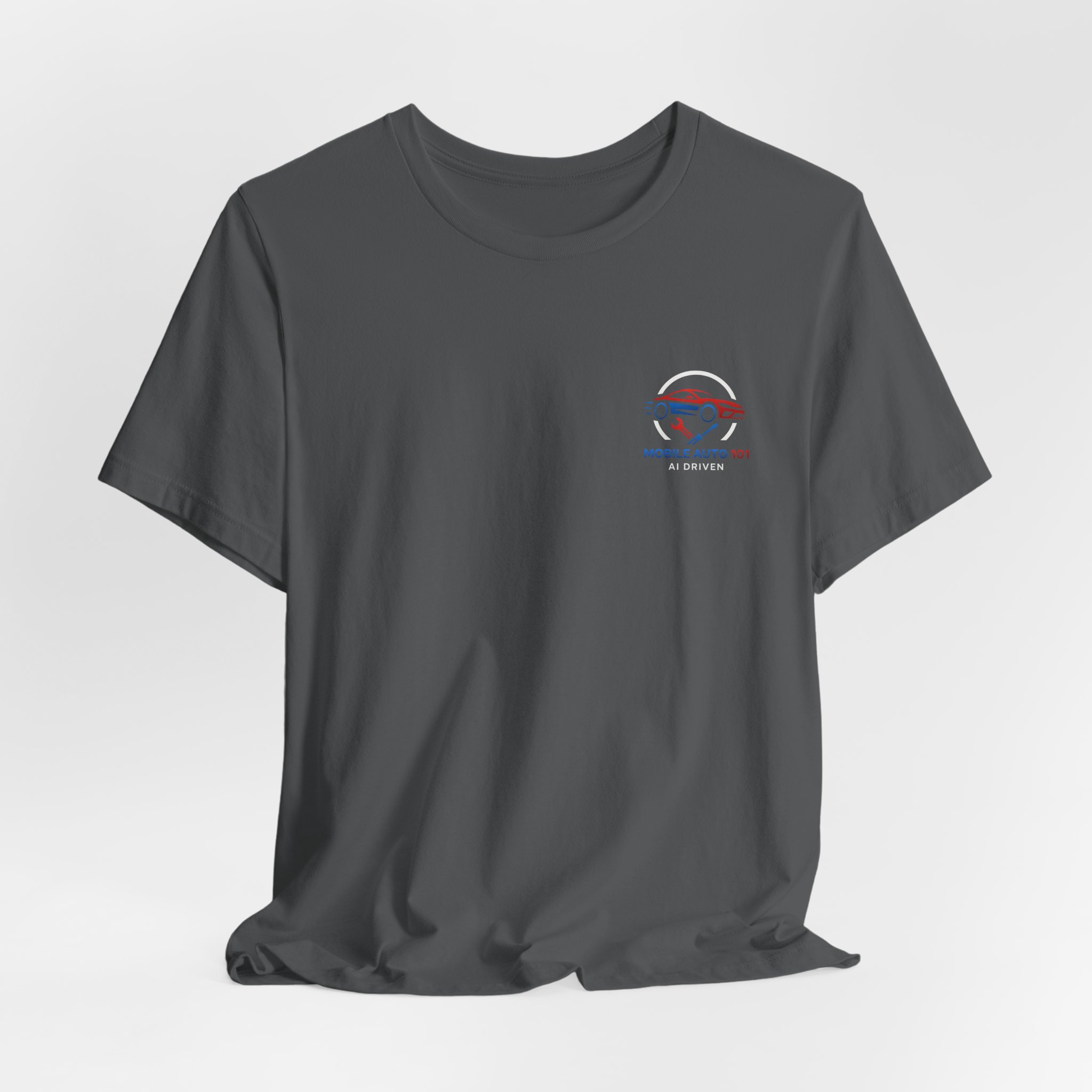 Check out the new logo for the updated mobile application Mobile Auto 101! This classic unisex jersey short sleeve tee fits like a well-loved favorite. Soft cotton and quality print make users fall in love with it over and over again. These t-shirts have-ribbed knit collars to bolster shaping. The shoulders are tapered for a better fit over time. Dual side seams hold the garment’s shape for longer. .: Made with 100% Airlume combed and ring-spun cotton, a lightweight fabric (4.2 oz/yd² (142 g/m²)) that is easy to layer, breathable. Perfect for active and leisure wear. .: The retail fit that is perfect for casual and semi-formal settings. The crew neckline adds a classic, neat style that’s perfect for accessorizing. .: Bella+Canvas manufactures all its products in the US and internationally in humane, no-sweat-shop, sustainable way and is part of the Fair Labor Association as well as Platinum WRAP certified. .: The tear-away label minimizes skin irritations. .: Fabric blends: Ash – 99% Airlume combed and ring-spun cotton, 1% polyester; Heather colors – 52% cotton, 48% polyester; Athletic Heather and Black Heather – 90% cotton, 10% polyester. S M L XL 2XL 3XL Width, in 17.99 20.00 22.01 24.02 25.98 27.99 Length, in 27.99 29.02 30.00 31.02 32.01 32.99 Sleeve length, in 8.90 9.17 9.45 9.72 10.00 10.39